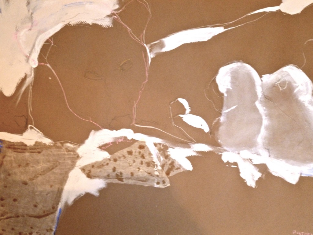 Françoise Steurs travaille, quant à elle, la matière. Ses œuvres sont créées sur un papier empreint d’imperfection sur lequel elle ajoute, par mouvements amples et dynamiques, des matières plus épaisses. Un véritable dialogue naît entre l’artiste et le papier. Lectrice compulsive, elle découpe des photographies de l’actualité qu’elle intègre ensuite dans ses toiles. Ces photographies sont retravaillées ou collées à l’état pur ou disparaissent dans la matière. L’artiste leur donne une autre dimension et leur permet de se révéler dans la toile pour acquérir une nouvelle présence. Ses toiles mettent en avant, intentionnellement ou non, des personnages solitaires, flottants, perdus. Pour cette exposition, elle troque ses personnages pour des lapins. A travers ceux-ci, elle nous emmène dans un voyage singulier dans l’immense fugacité du monde contemporain. Son travail plastique retrace un itinéraire de la mémoire sur papier journal. « C’est peut-être en nommant les choses qu’on peut se débarrasser du côté pesant des choses », cette phrase, tirée du livre « La Reine du Silence » de Marie Nimier, s’applique aussi bien aux mots qu’à la peinture de Françoise Steurs.