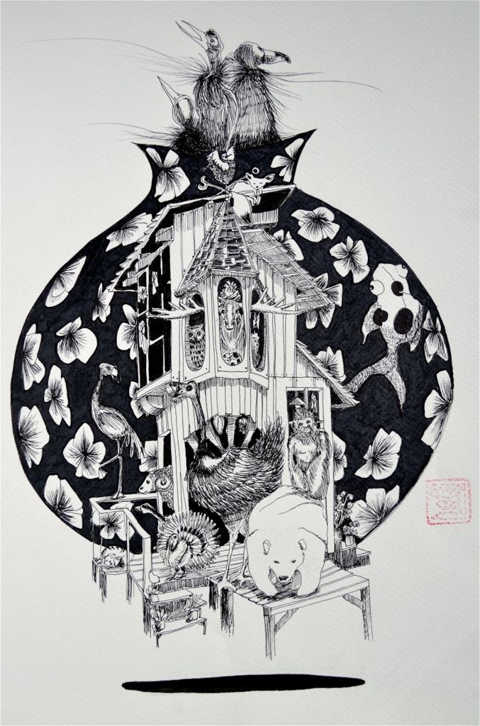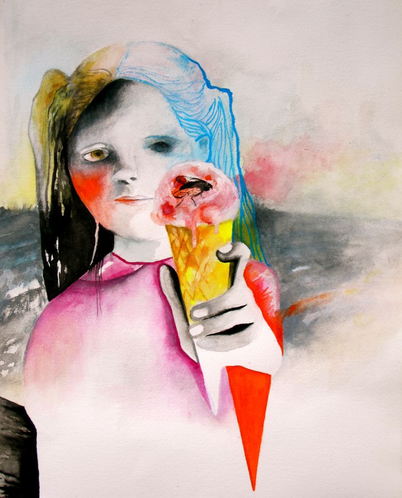 Hanna Ilczyszyn est une jeune peintre polonaise vivant en Belgique. Elle a étudié à l’Académie Royale des Beaux-arts de Gand et à l’Académie des Beaux-arts de Wroclaw en Pologne. Ses dessins sont en noir et gris rehaussés de plages de couleurs vives. Son travail plastique capture l’innocence et l‘incertitude de l’enfance. Les œuvres d’Hanna laissent entrevoir l’anxiété et la confusion des enfants qui évoluent dans un monde imprévisible où tout est neuf. Un masque de lapin dissimule le visage de certains enfants, rendus impersonnels. D’autres sont déguisés en lapin multicolores, renvoyant aux jeux appréciés par les enfants : cache-cache, se déguiser, mettre des masques…