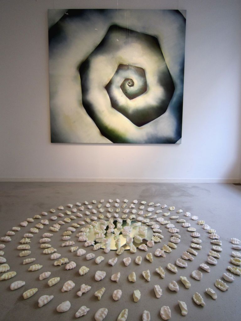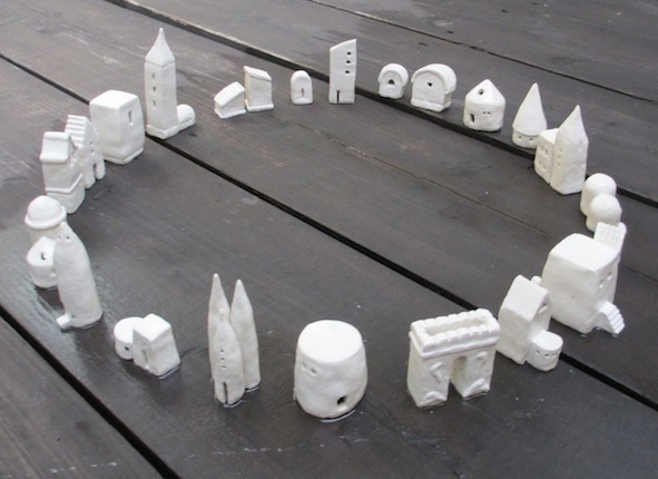 Yuko Nakaya est une artiste japonaise. Elle vit et travaille à Nagoya. Elle a passé 4 années à Bruxelles durant lesquelles elle a fréquenté l’Académie de des Beaux-Arts de Watermael-Boitsfort. C’est la deuxième fois qu’elle participe à une exposition à la galerie Arielle d’Hauterives. C’est une colonie de petites maisons blanches que présente Nakaya. Chaque petite maison a été modelée pour être unique, charmante, dressée fièrement comme un pion de jeu d’échecs. Mises les unes à côté des autres, toutes ces maisons forment des villes et font comme une tribu de personnages. Leurs fenêtres sont des yeux, leur porte, leur bouche. Derrière le côté ludique, derrière la simplicité de la blancheur du matériau utilisé, c’est comme un ensemble d’âmes, ou des parcelles de celle de l’artiste qui font le guet, ne laissant entrer personne. Le spectateur se penche sur les cercles formés par les maisons rassemblées, en sent l’harmonie, mais aussi l’autarcie. Une grande poésie se dégage de ces cercles fermés.