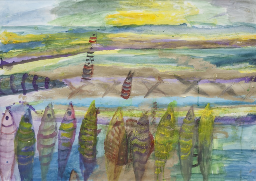 Raphaèle Bernard-Bacot place la danse au coeur de sa démarche artistique depuis sa collaboration avec le chorégraphe Serge Ricci pour la réalisation du livre d’artiste «16 Figures». C’est la nature morte qui l’occupe aujourd’hui. Raphaèle Bernard-Bacot s’emploie avec ses « Fruits dansés » à mettre en mouvement les récoltes du potager du roi de Versailles. Mêlant une représentation réaliste d’un radis, d’une aubergine… avec un arrière-fond mis en couleurs de manière plus brute (coups de brosses, taches,…), elle fait littéralement danser le végétal représenté. Presque musicaux, ses dessins sont rythmés par les « poses » prises par les morceaux de nature que l’artiste choisit de représenter. C’est, comme souvent loin d’être une nature morte. Voici dont une nature vive, bien vive. Sa palette aux tons doux et sourds offre un rendu extrêmement plaisant.