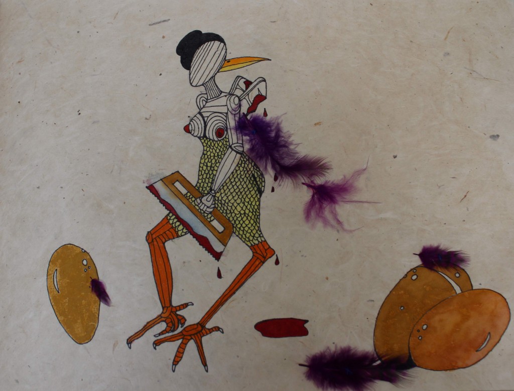 Son travail se déploie sur différents types de supports : dessins, installations, mixed medias ou vidéos. Son laptop est devenu une fenêtre sur son pays. Une fenêtre qui crache des photos qu’elle imprime sur toile pour les perforer de trous qui prolifèrent comme la censure. Les dessins de la série Let it be évoquent des scènes entre rêve et la réalité qui laisse ses fils rouges, ses bandes de collant et des bouts de texte en persan. Elle se met en scène croquée d’un trait rageur, frontal et ironique à la limite de la farce avec l’image obsédante des cafards qui grimpent sur les corps ou se multiplient comme une menace incontrôlable. La menace est aussi présente dans son film « My fingers grew and stuck to the asphalt » une métaphore poétique qui respire et rêve avec les habitants d’une ville sous la menace d’un mystérieux et fatal poison.