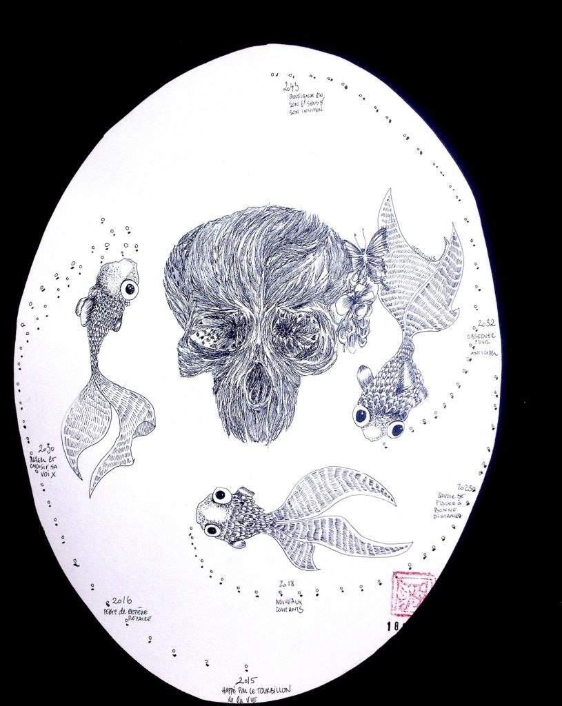 Ses thèmes récurrents sont l’oeuf et des trompes de Fallope. En filigranes aussi, les chiffres 28 (en référence au cycle menstruel) et 13 (le nombre théorique de cycles annuels).